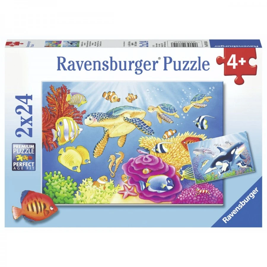 Let your pint-sized puzzlers have double the fun with these two unique and colourful Underwater puzzles. This beautifully illustrated children’s puzzle from Ravensburger features artwork from their Oceans and Seas collection. This colourful Underwater Puzzle contains two puzzles, twenty-four pieces of each. The Ravensburger Colourful Underwater World puzzle has families of dolphins and orca whales, fish, and turtles swimming in the coral reef. This nicely illustrated puzzle perfectly captures the vibrance under the sea and will excite every little puzzler. All Ravensburger puzzles are made with high-quality cardboard combined with linen finish print to create antiglare puzzle images. With Ravensburger, every piece is unique and made with soft-click technology to ensure it fits and locks perfectly. Puzzles are perfect for every kid as it helps to develop building skills, problem-solving skills, and fine motor skills amongst children. The Ravensburger Colourful Underwater World puzzle features a plethora of underwater creatures. The Colourful Underwater World puzzle is recommended for kids aged four years and above.