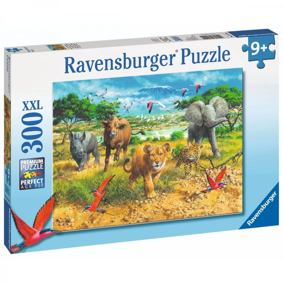 This puzzle from Ravensburger has 300 XXL size puzzle pieces featuring a scene from the African savannahs that has a watering hole and lots of animal babies. Brightly coloured birds can be seen flying in the sky. It is a part of Ravensburger’s Wild Animals Collection and is recommended for children over 9 years of age. The puzzle is good for young puzzlers who are learning about animals and their young ones. Ravensburger is a popular puzzle manufacturing company which uses handcrafted tools for creating puzzles. These puzzles are made of premium cardboard which ensures durability and is finished with linen-structured paper to minimize glare on the puzzle pieces. This helps puzzlers work for long hours on the puzzle without stressing their eyes. All pieces are unique to avoid confusion when you are putting the pieces together. The XXL pieces are easy to handle. When completed, the puzzle measures approximately 49cm x 36cm.