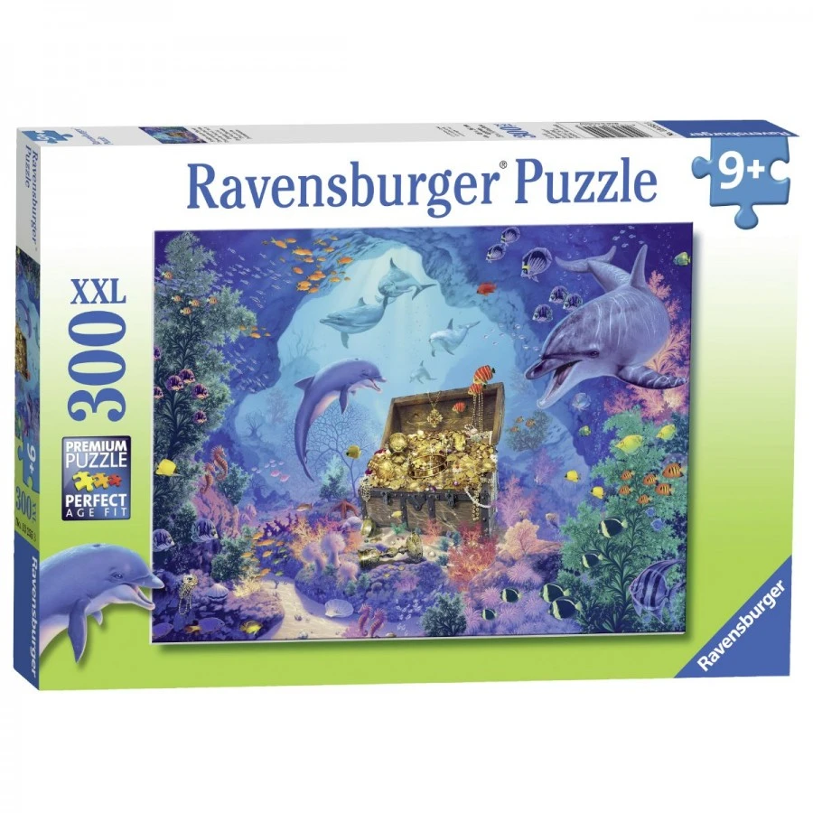 Deep-Sea Treasure by Ravensburger is a beautiful 300-piece puzzle featuring underwater scenes with aquatic animals, treasure and lots of marine corals. You will find the puzzle to be mostly in hues of blue, including the pod of dolphins protecting the treasure. But there is a burst of gold in the illustration which comes from the treasure. Some more colour is added to the puzzle by the tropical fish seen swimming around the treasure. The puzzle pieces are XXL in size, which means they are more significant than usual Ravensburger puzzle pieces, which makes it easy for puzzlers to handle the pieces. Ravensburger uses high-quality, recyclable cardboard, which provides durability to the puzzle. Additionally, the pieces finished with the linen-structured paper, which intends to reduce glare from the puzzle, and allows puzzlers to work on it for long hours without stressing their eyes. The finished puzzle measures 50cm x 36cm. Recommended for puzzlers over 9 years old.