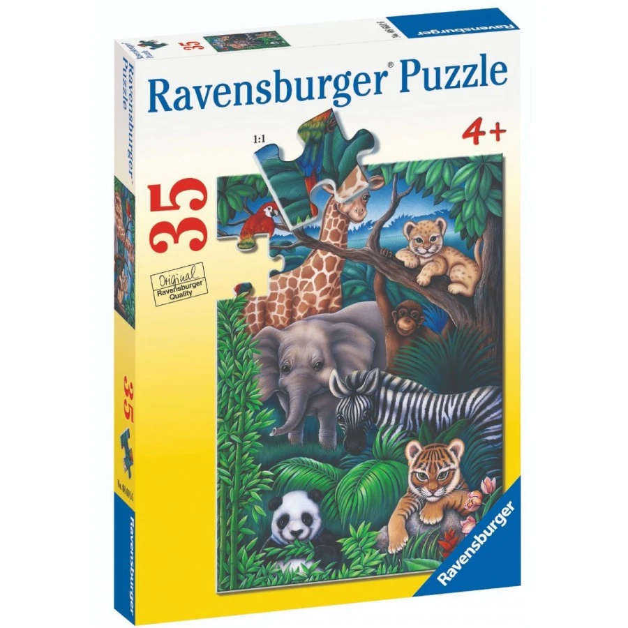 This is an interesting 35-piece puzzle that is recommended for children of age 3 years and above. The image of these puzzle pieces once solved is that of some animals and birds in a jungle. Some animals in the puzzleÃs image include a tiger, monkey, zebra, panda, elephant, giraffe, leopard, and macaw all together in a jungle. The puzzle pieces are large and made of sturdy thick cardboard so that they donÃt bend or tear when handled roughly by the children while playing. The puzzle pieces have passed several international and national safety standards tests before being made available to you. Children will love to put together this exciting puzzle to see their favourite jungle animals. It will keep them occupied during their playtime. It can also be used as a fun game at a childrenÃs birthday party. It can also be given as a gift to children on various occasions ñ birthdays, Christmas, etc.