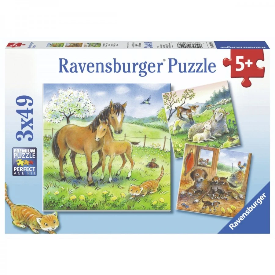 Cuddle Time is a set of three jigsaw puzzles by Ravensburger. Each puzzle has 49 pieces. All of them depict animals cuddling with their babies. The first puzzle shows a dog sitting in a barn, surrounded by her pups. Some of the puppies try to strike a conversation with some chickens while you can see the mother hen and a cockerel in the background. The second puzzle is of a mare and her foal in a green field. The last puzzle has a sheep with her lamb sitting on the top of a lush green mountain while a few goats and sheep graze in the background. All of the Ravensburger puzzles are manufactured with high-quality, durable cardboard. The puzzle pieces are finished with linen-structured paper to reduce glare from the puzzle surface. No two pieces are designed to be the same to minimise frustration in doing the puzzle. Additionally, when you put the correct pieces together, you will hear a soft click that confirms that the pieces have been appropriately interlocked. The puzzles are punched out with handcrafted steel cutting machines, which cut the pieces with precision. When finished, each puzzle will measure approximately 21cm x 21cm. It is recommended for puzzlers over 5 years old.