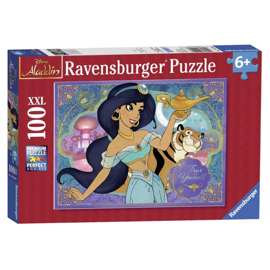 Elegant and delightful, this 100 piece Ravensburger puzzle of Princess Jasmine and her loyal friend Rajah the Tiger, from the popular Disney movie Aladdin. Jasmine’s beauty and courageous energy shine through in this colourful and beautifully illustrated image. An inspirational message is also on the puzzle ‘True to Yourself’ which promotes positive thinking. Puzzles help children develop while playing and having fun. They not only improve concentration and motor skills but also encourage patience. The pieces are extra-large, and the puzzle once completed measures 49 x 36 cm. All pieces are of high quality, and they are steel cut, which offers an interlocking firm fit positioning. Every single piece is a different shape, and the extra thick feature ensures your puzzle is dust-free and long-lasting. They are made out of linen-structured paper which eliminates the usual glare found in other puzzles. Recommended for ages 6 and over.